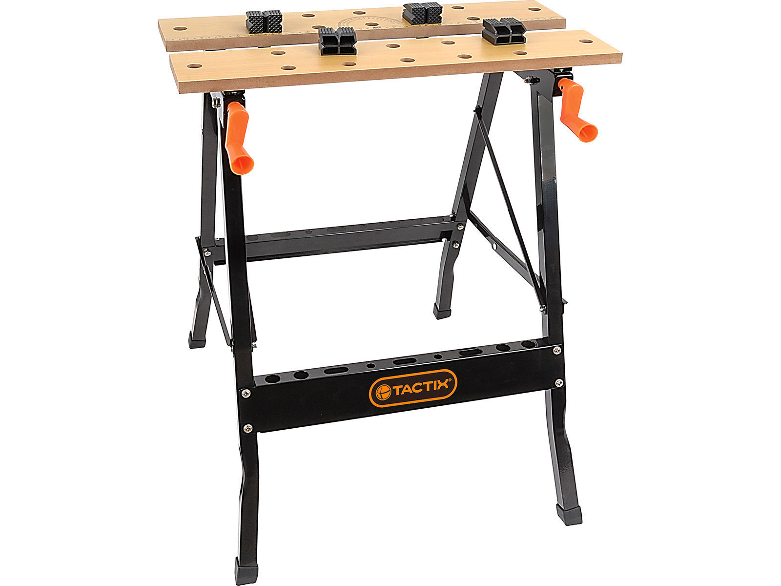 Sammenleggbar og bærbar arbeidsbenk med 24 hull for klemmefester. Dette gir god fleksibilitet for tilpasning til arbeidsstykket som skal festes. 4 klemmefester i plast følger med. Benken tåler belastning på opptil 100 kg. 2 delt benkeplate i MDF har maksimal klemmebredde på 240 mm ved bruk av klemmefester. Klemmebredden justeres enkelt med doble sveiver som kan justeres individuelt. Benkeplaten har påtrykket linjal og vinkelmåler. Mål (BxDxH) 640x605x820 mm.