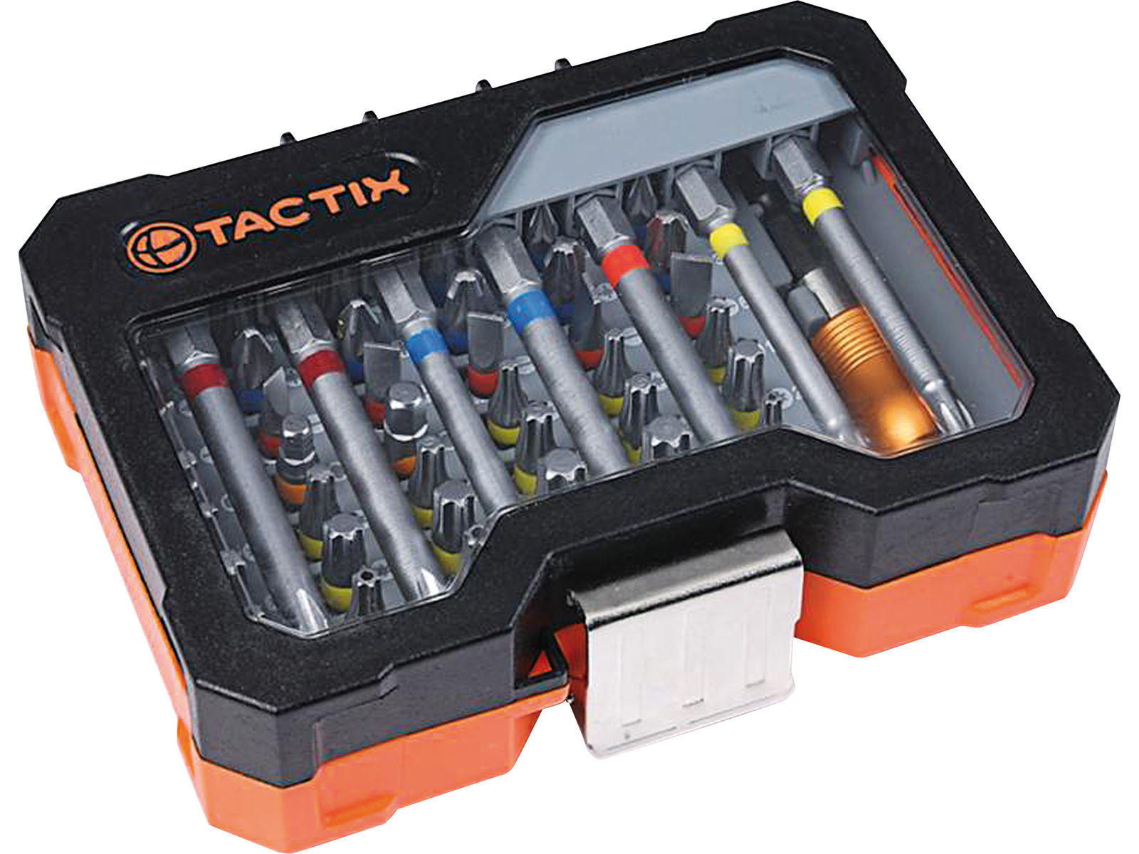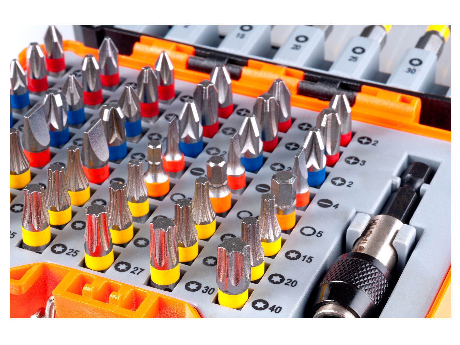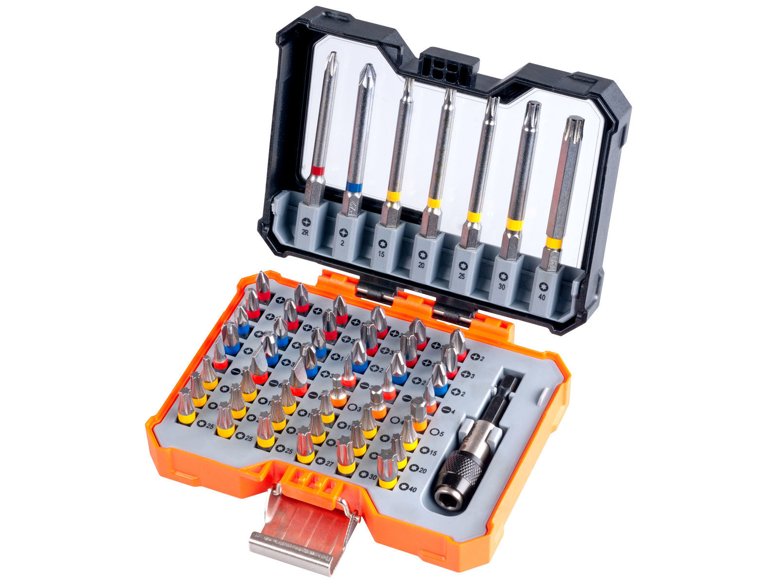 Bitssett i 56 deler i S2 kvalitet med fargekodete bits. Inkludert bitsholder med hurtigchuck. Bits 25mm: Flat: 2 x SL3, 2 x SL4, 2 x SL6.5, Philips: 3 x PH1, 6 x PH2, 3 x PH3, Pozi: 3 x PZ1, 3 x PZ2, 3 x PZ3, Sekskant: HX3, HX4, HX5, Torx: 3 x TX10, 3 x TX15, 6 x TX20, 3 x TX25, TX27, TX30, TX40. Bits 75mm: Philips: PH2G, Pozi: PZ2, Torx: TX15, TX20, TX25, TX30, TX40