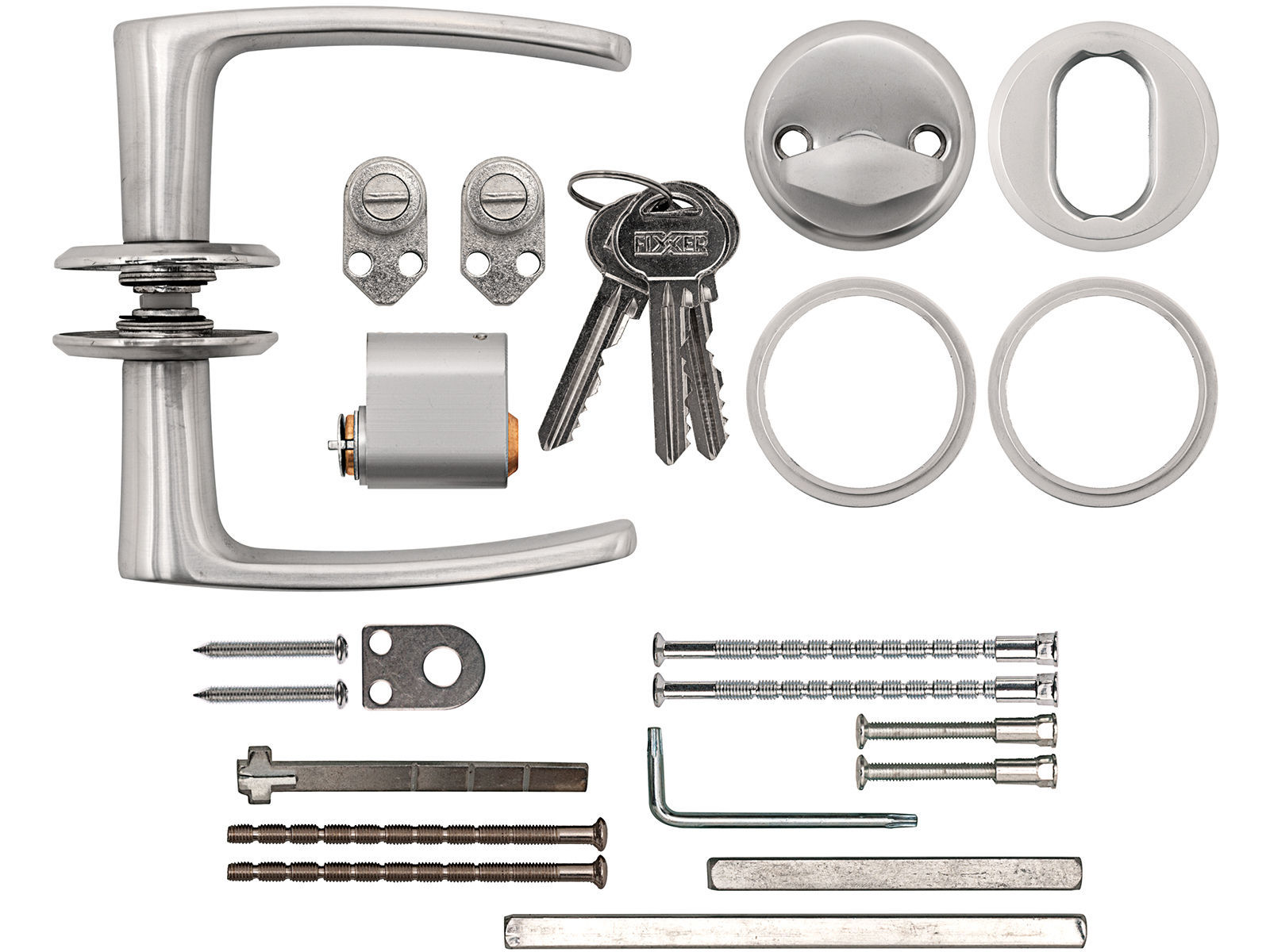 Settet inneholder: sylinder 75537 med 3 nøkler, vriderknappsett, sylinder-ring 2x7 mm, skilt 1x9 mm, sylinderforlenger 1x8 mm, 1x12,5 mm, kappbar sylinderskrue 5x56 mm, 2 stk skruer 5x40 mm, 2 stk 5x90 mm, 2 stk muttere 5x15 mm, 2 stk pinner 8x98 mm og 8x140 mm, samt Torx 20 L-nøkkel.