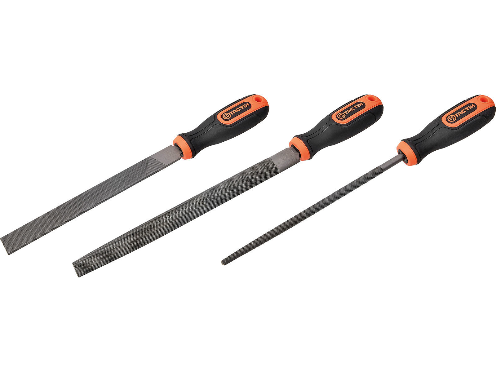 Sett med 3 filer, alle i lengde 200 mm + skaftlengden. 1 flat-, 1 rund- og 1 halvrund fil. Med ergonomisk 2-komponent hådtak.