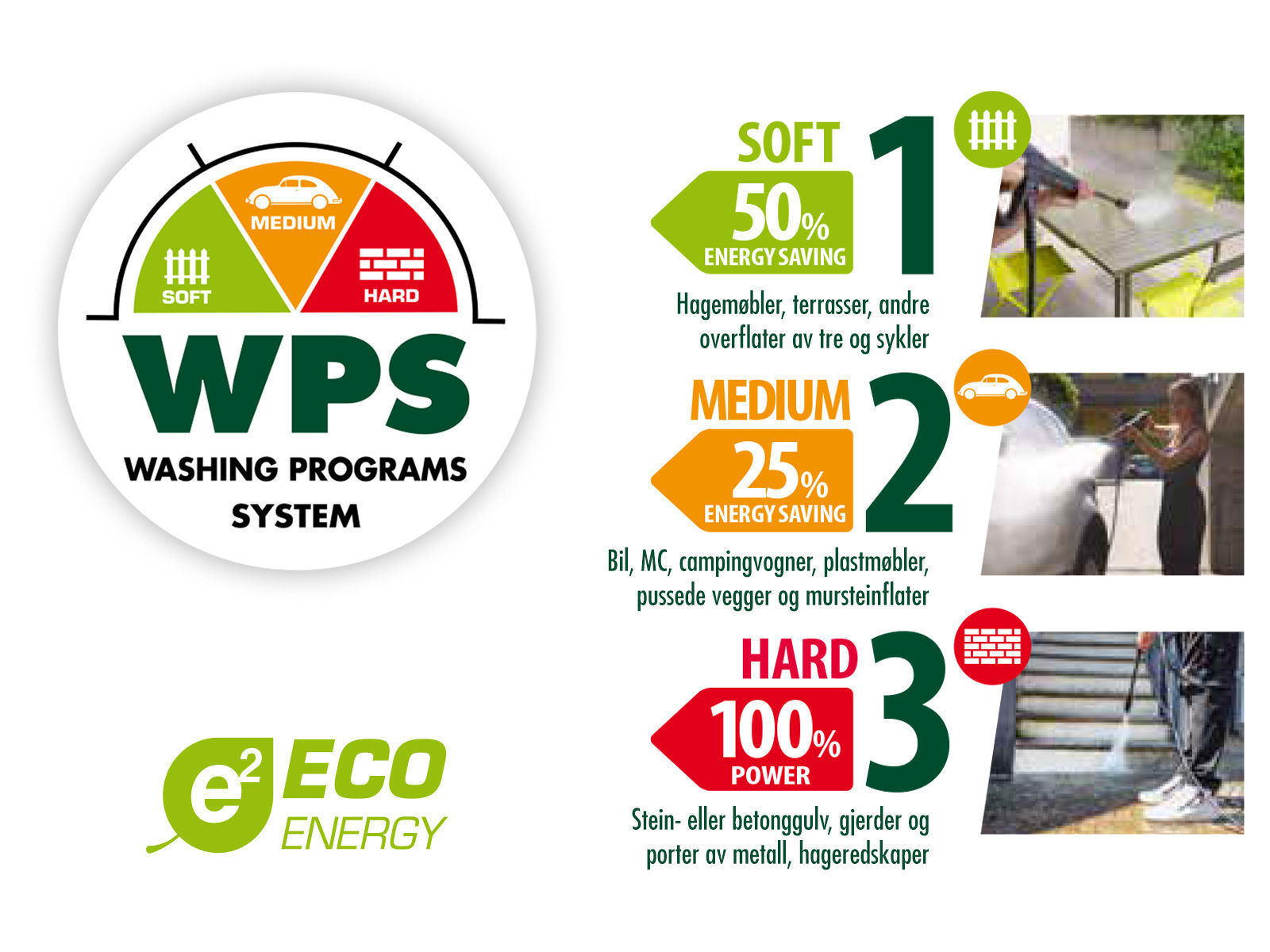 Vaskeprogrammene er optimalisert med tanke på trykk, levert vannmengde og driftsøkonomi. SOFT og MEDIUM sparer strøm og vil forlenge høytrykksspylerens levetid. HARD gir deg maks kraft når du trenger det!