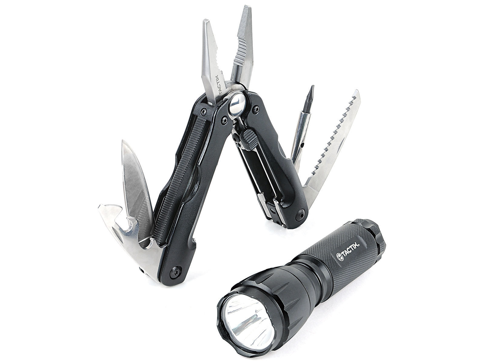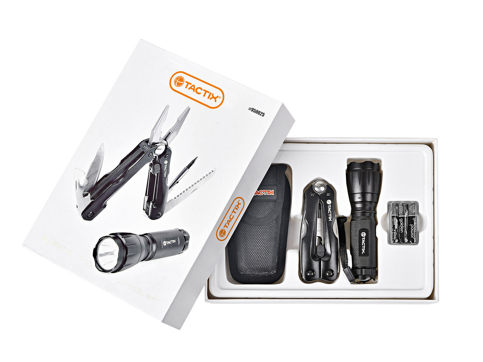 Settet inneholder multiverktøy med futteral, og 3W CREE LED lommelykt med batterier.