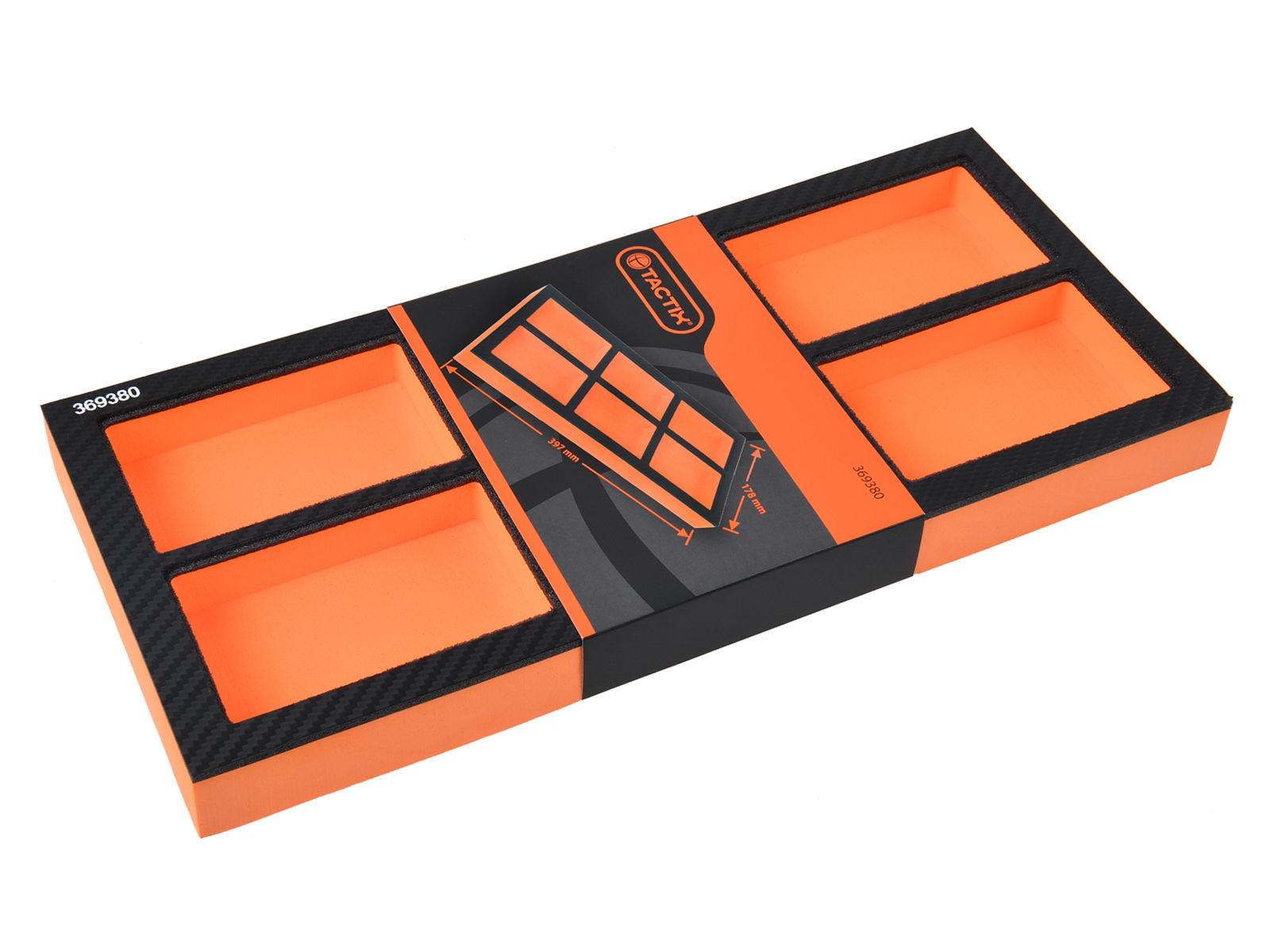 Skuffeinndeling med 6 rom for å organisere mindre verktøy, festemateriell og annet utstyr. Konstruert i slitesterk plast som er løsemiddel- og UV-bestandig. Mål (BxDxH) 397x178x42 mm.