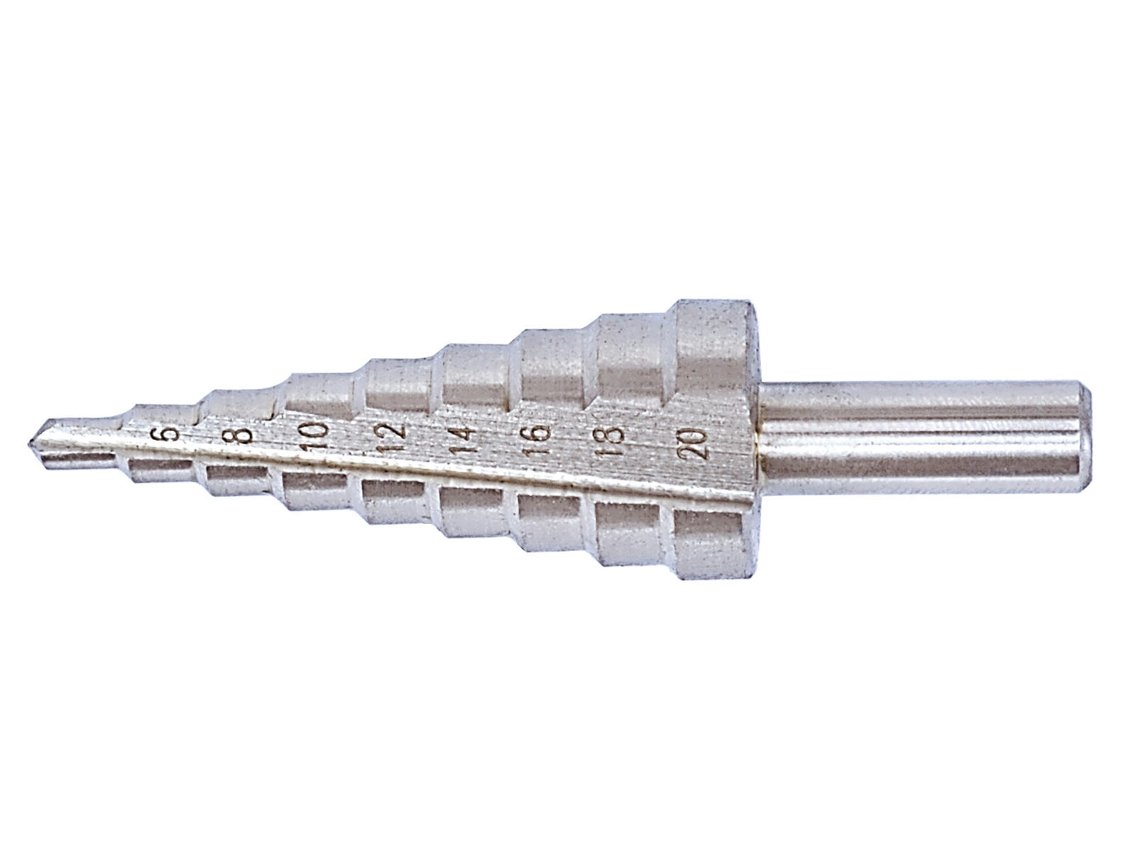 Toskjærs stegbor av kraftig hurtigstål med 2mm intervall. For å lage hull i stålplate, aluminium og plast. Gir gradfrie snitt uten deformering. Sylindrisk feste med tre plane anleggsflater: Ø 8 mm.