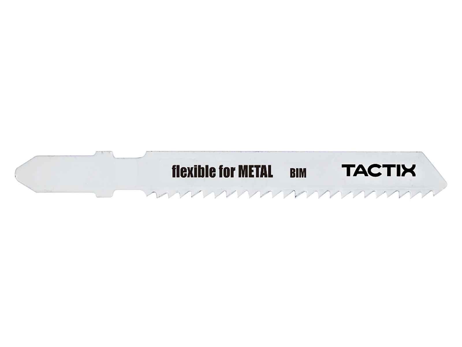 Flexible for Metal stikksagblad er bruddsikkert ved rette kutt i metall. De valsede bølgetennene er utformet for å kutte metallplater. Bladmateriale av BIM (bi-metall) noe som reduserer risikoen for brudd og gir den nødvendige hardheten og fleksibiliteten til å kutte perforerte metallplater laget av stål med standard hardhet. Det har fin progressiv tannavstand (2,1 mm) og kutter mange ulike middels tykke metallplater med en tykkelse på 2,5-6 mm. T-feste.