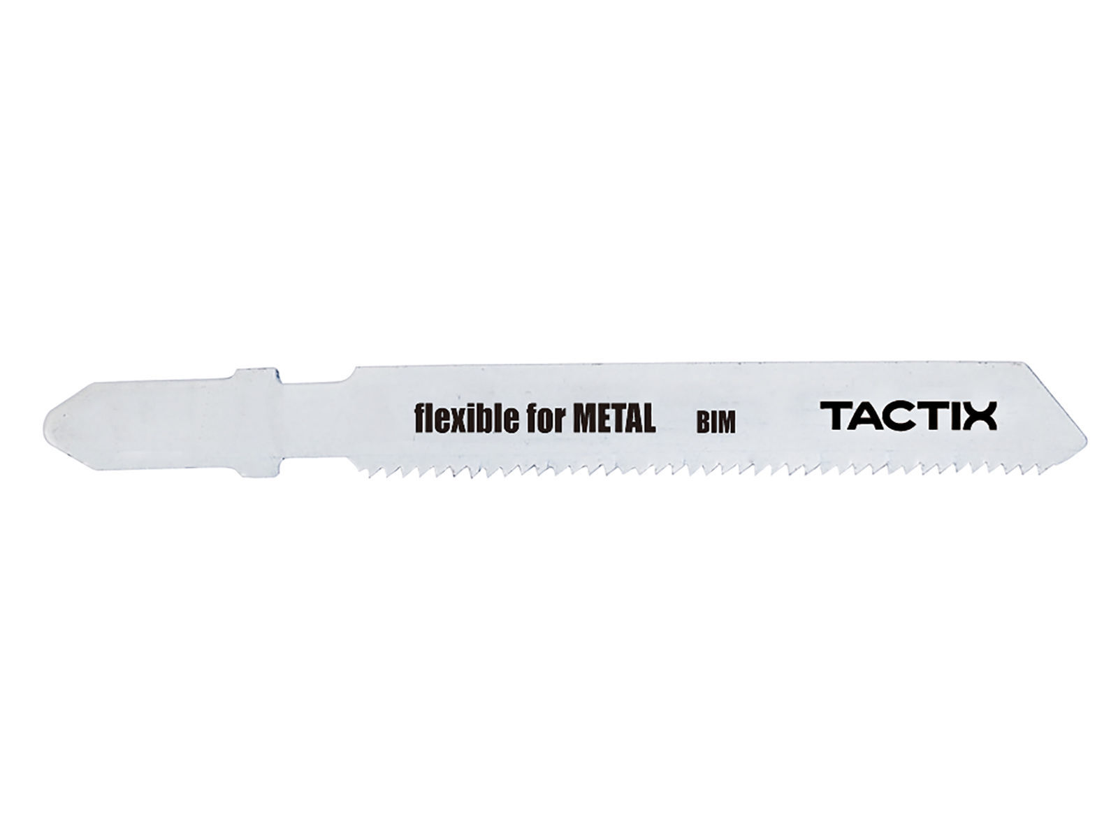 Flexible for Metal stikksagblad er bruddsikkert ved rette kutt i metall. De valsede bølgetennene er utformet for å kutte metallplater. Bladmateriale av BIM (bi-metall) noe som reduserer risikoen for brudd og gir den nødvendige hardheten og fleksibiliteten til å kutte perforerte metallplater laget av stål med standard hardhet. Det har svært fin progressiv tannavstand (1,2 mm) og kutter mange ulike tynne metallplater med en tykkelse på 1,5-3 mm. T-feste.
