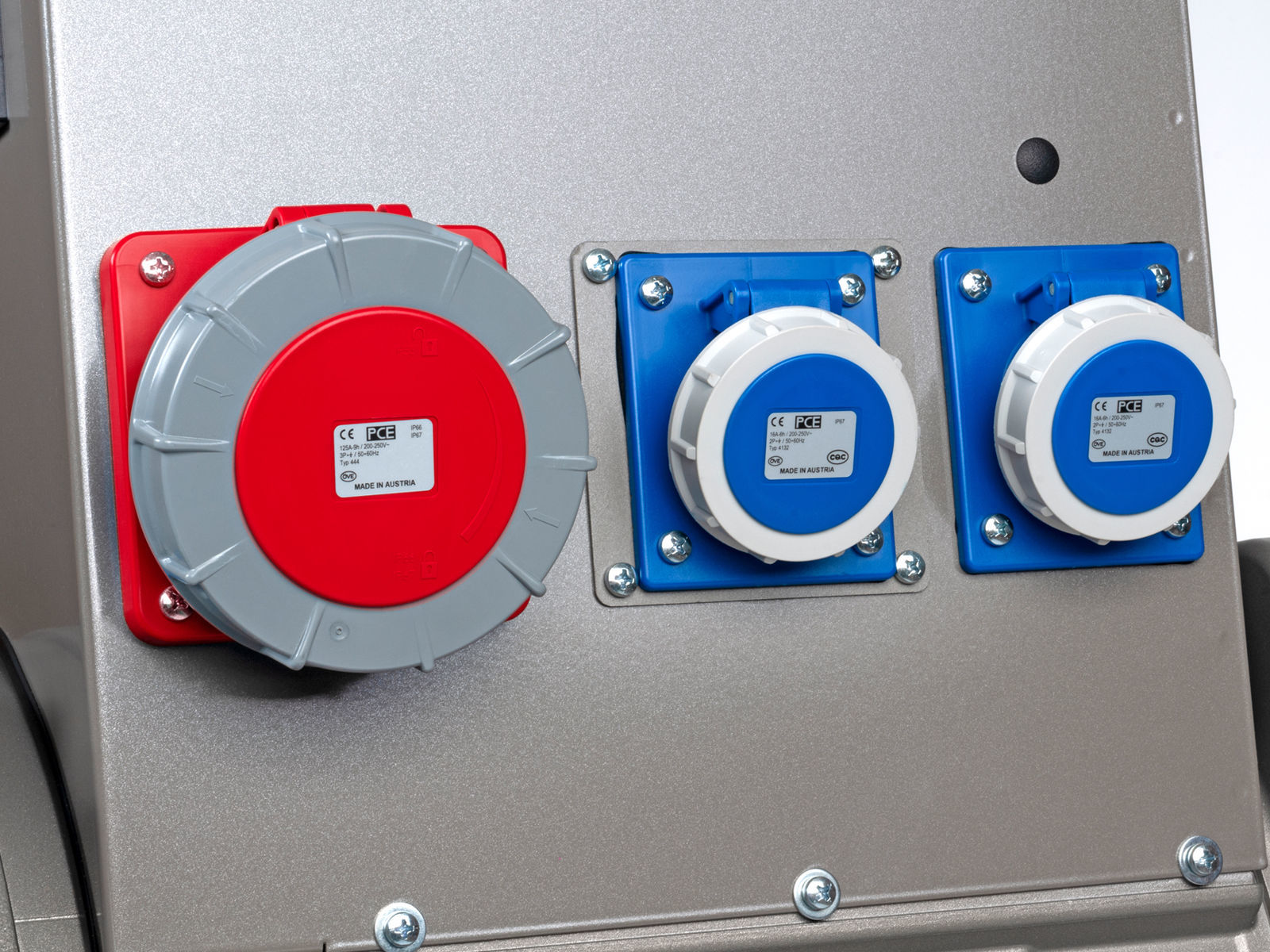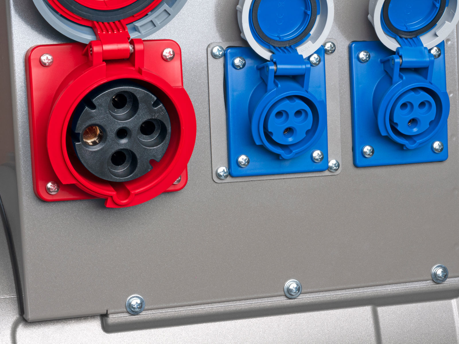 Aggregatet er utstyrt med AVR (automatisk spenningsregulering), voltmeter, amperemeter, frekvensmåler, timeteller, ett 3-fase strømuttak (400V, 63A), to 1-fase strømuttak (230V, 16A) og sikringer for alle kurser. Videre leveres generator og panel i sprutsikker utførelse (IP44).