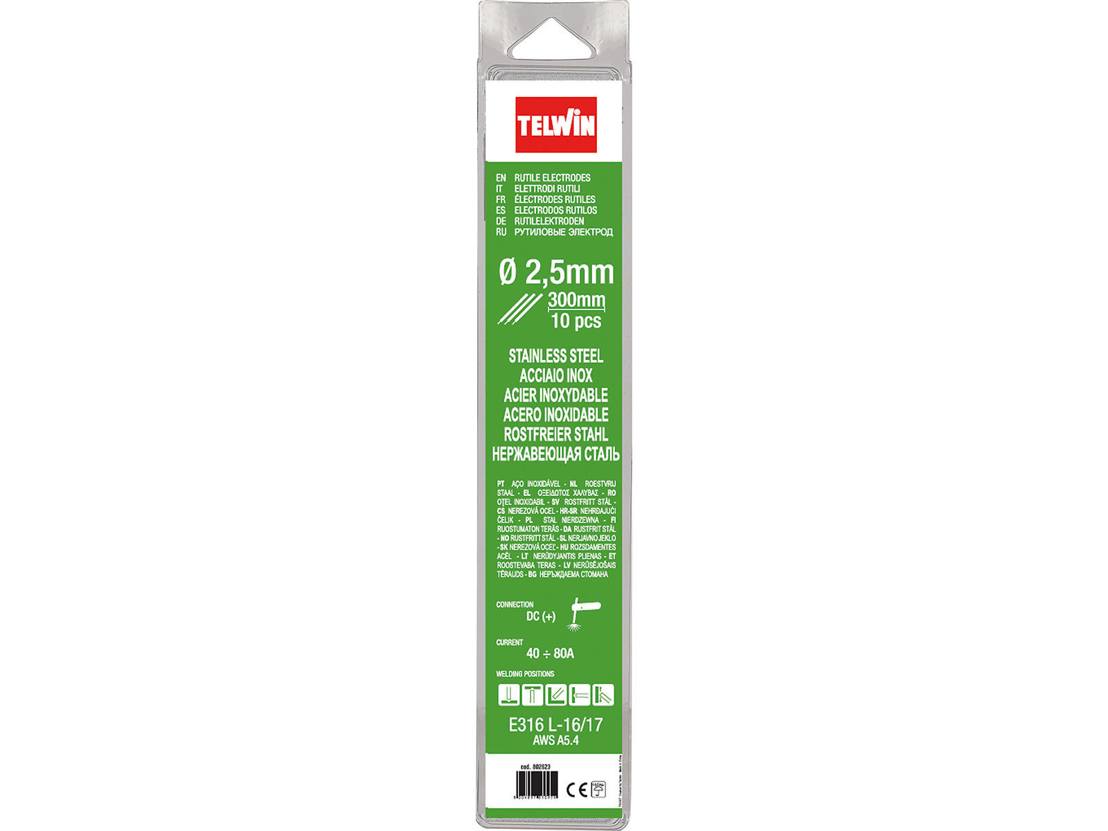 Sveiseelektroder i rustfritt stål i praktiske blisterpakninger. Det spesielle belegget på elektrodene gir den en utmerket overflate etter størkning og garanterer utmerket overflatebehandling av sveiseoperasjoner. De kan brukes i alle posisjoner og garanterer gode nivåer av stabilitet for buen; sveising kan utføres ved hjelp av Invertert polaritet kontinuerlig strøm (positiv med elektrodeholderklemme) og i vekselstrøm med utmerkede mekaniske egenskaper i smeltesonen. De brukes til sveising av gjennomsnittlige tykkelser.