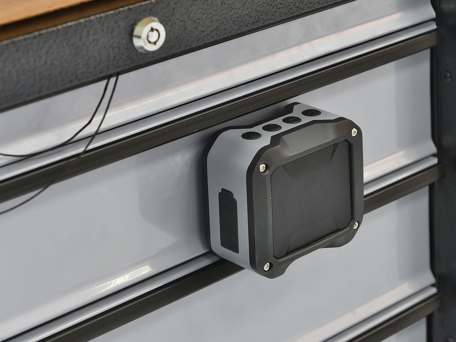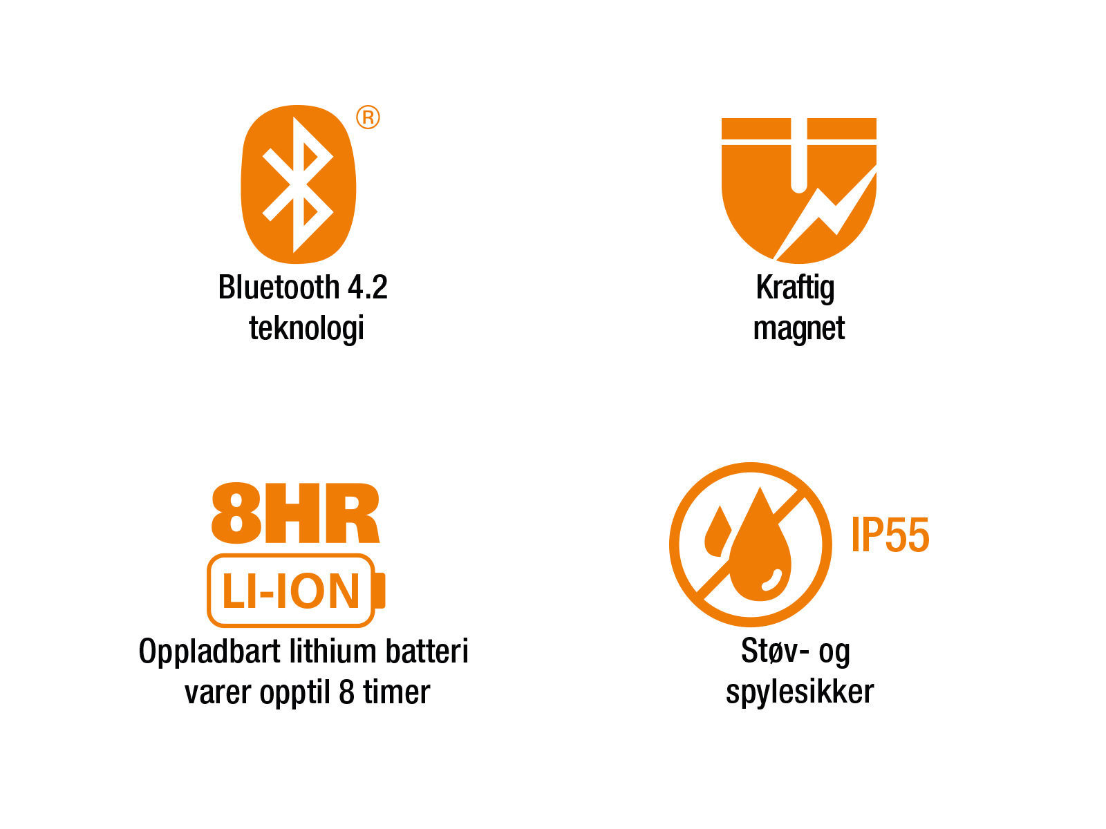 Trådløs høyttaler som spiller av lyd fra hvilken som helst Bluetooth enhet. Innebygd mikrofon slik at du kan svare på handsfree-samtaler. Magnetisk bakside - heng høyttaleren på verktøyvogna. Belteklips - ta med deg høyttaleren i verktøybeltet. 3.5 mm AUX gjør at høyttaleren kan kobles til portable lydenheter. 8 timers spilletid pr lading - leveres med oppladbart batteri. Beskyttelsesklasse: IP55. Mål (LxHxB) 97x91x56 mm. Leveres med ladekabel.