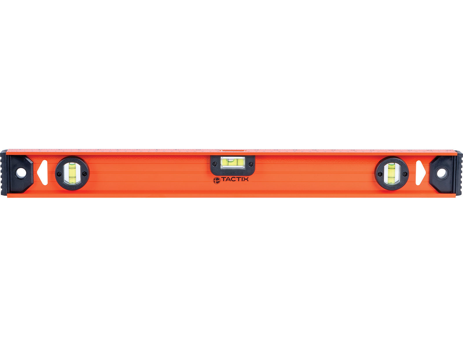Aluminiumprofil med tre libeller, 2 vannrett og 1 loddrett. Planfreste anleggsflater og frest V-spor på undersiden (sikrer bedre presisjon på rør). Støtdempende endestykker