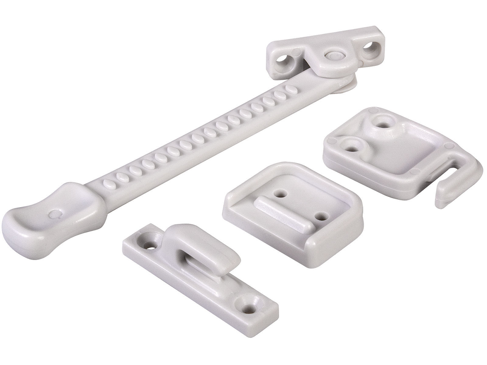 Luftebeslag for montering på dør eller vindu, både inn -og utadslående. Mange justeringsmuligheter. Utført i robust plast. Monteringsskruer medfølger.