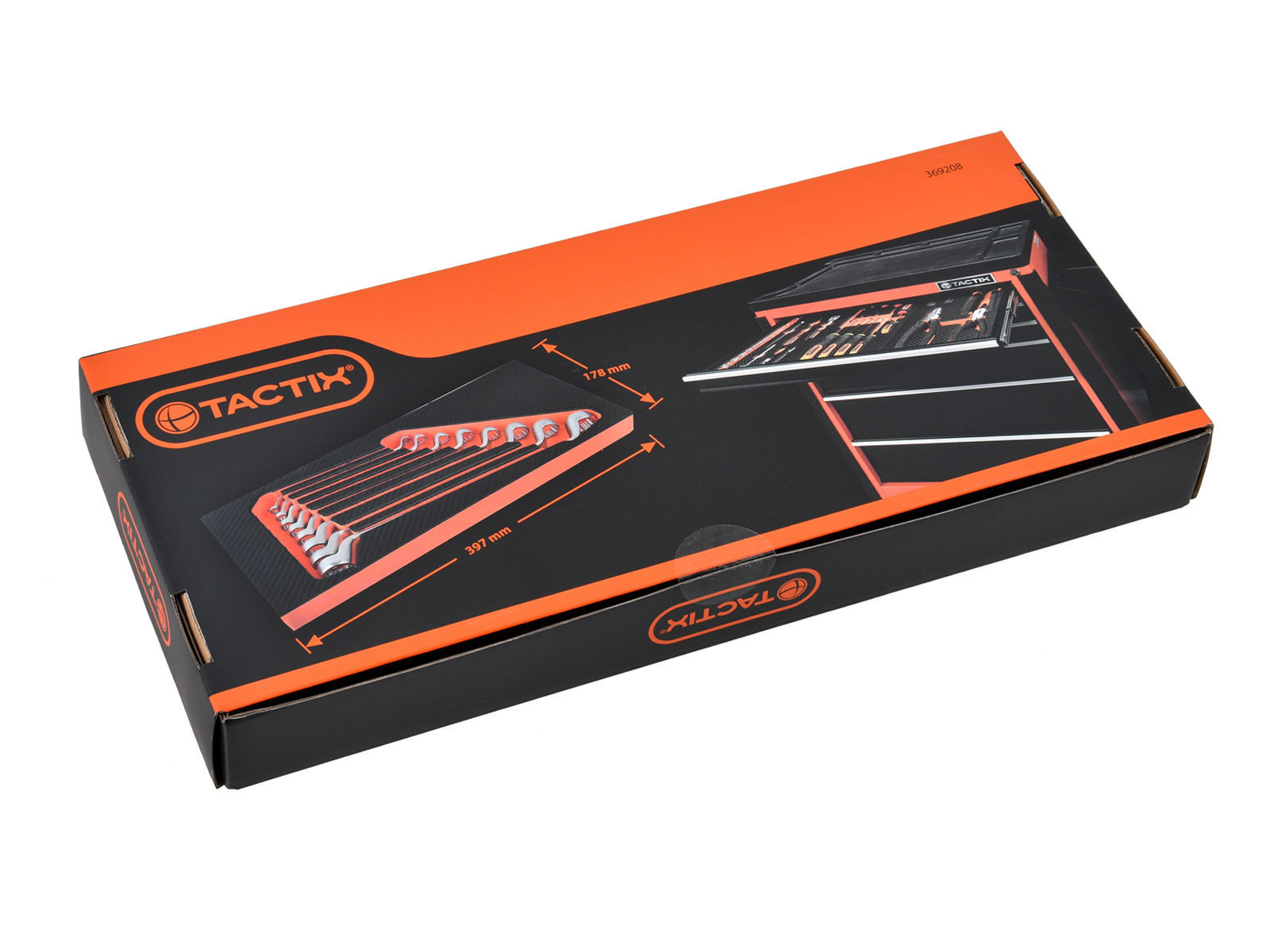 Verktøysett som gir deg enkel og ryddig organisering av dine verktøy. Med det to-fargede skuminnlegget ser du umiddelbart hvor verktøyet skal plasseres og om det er verktøy som mangler. Passer til Tactix skap. Størrelsen på settet er (BxL) 178x397 mm.