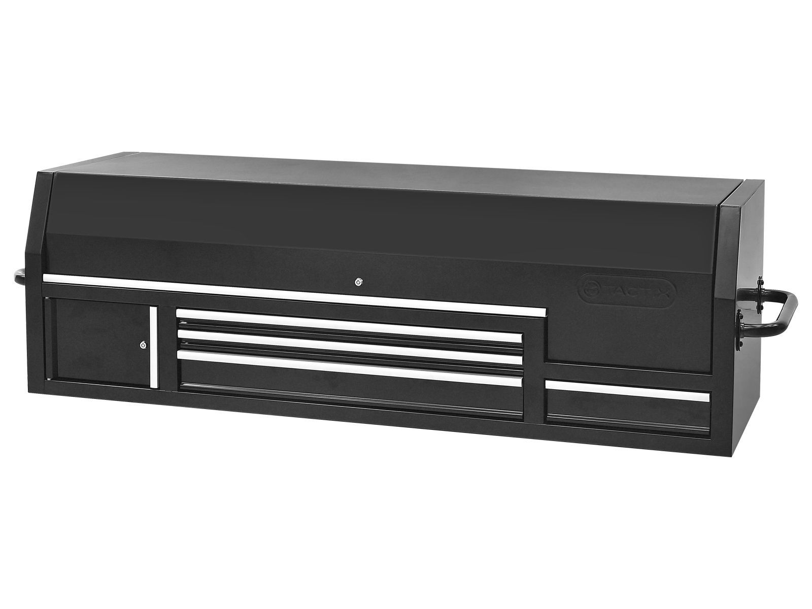 Topplokket åpnes og lukkes enkelt med gassfjærer. Solide sidehåndtak på hver side av skapet gjør det enkelt å flytte med seg ved behov. Passer til verktøyvogner med bredde på 183 cm.