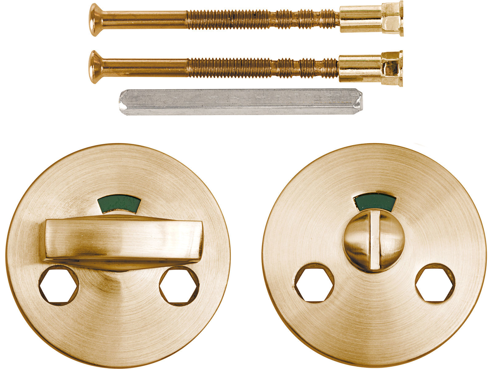 WC-garnityr av zink/alloy for innerdører. Messing utførelse. Passer til dørtykkelse 35-60 mm. Leveres komplett med skilt type R1K1, samt skruer og tilbehør. En del av PREMIUM & EXCLUSIVE-seriene.